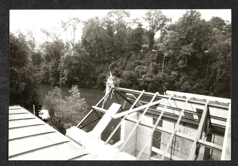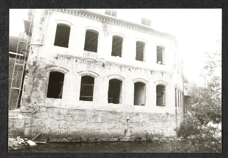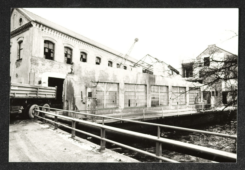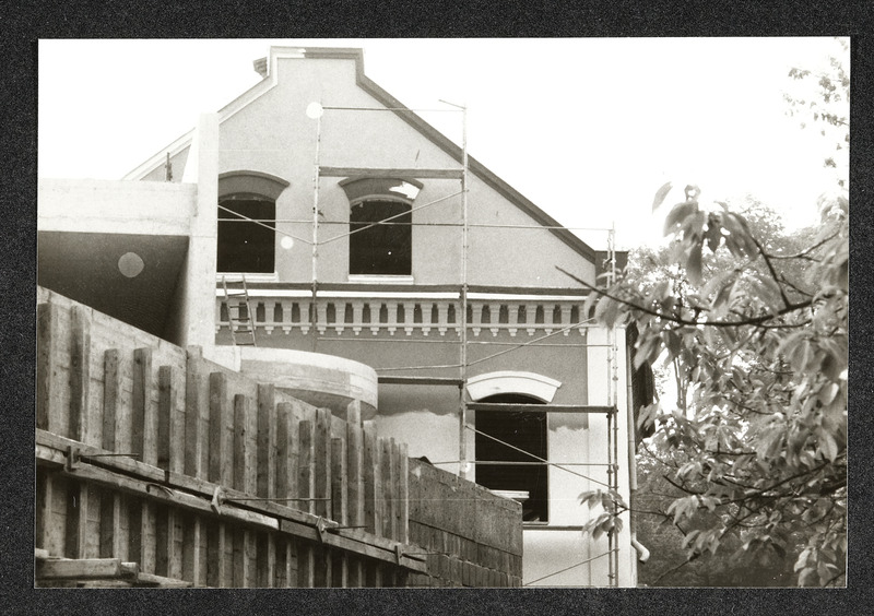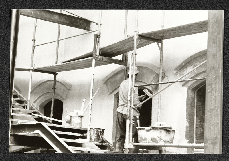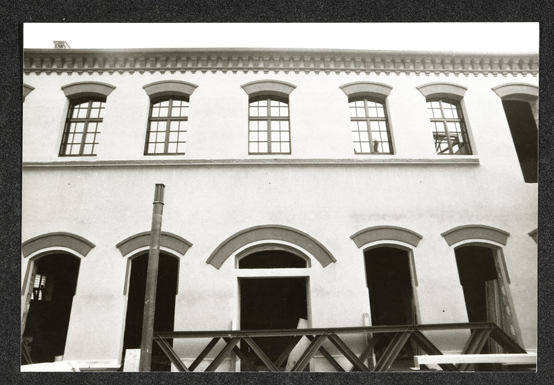 Bauarbeiten an der Außenfassade des Museum Industrielle Arbeitswelt Steyr. Das Foto zeigt den ehemaligen Wirtschaftstrakt ("Bomberhalle"), bei dem ein Flachdach eingezogen wird.