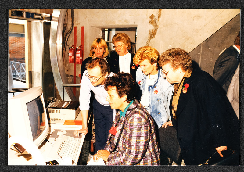 Besuch der Landesausstellung 1987 "Arbeit Mensch Maschine: Der Weg in die Industriegesellschaft" von Frau Ministerin Hilde Hawlicek am 1. Mai 1987. Das Foto zeigt Fr. Ministerin Hilde Hawlicek sitzend und "telefonierend", neben ihr steht Hans Hoffer, der künstlerische Gestalter des Museums.