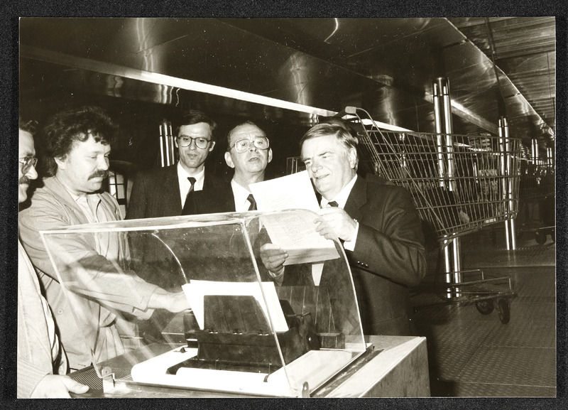 Besuch der Landesausstellung 1987 "Arbeit Mensch Maschine: Der Weg in die Industriegesellschaft" von Minister Egmont Foregger. Das Foto zeigt Minister Egmont Foregger lesend. Neben ihm steht Heinrich Schwarz, der damalige Bürgermeister von Steyr.