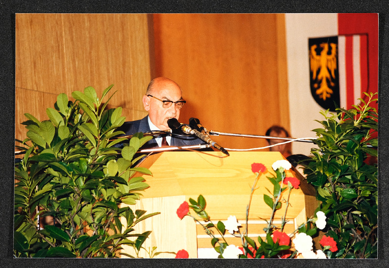 Festakt am 30. April 1987 im Stadtsaal Steyr anlässlich der Eröffnung der Landesausstellung 1987 "Arbeit Mensch Maschine: Der Weg in die Industriegesellschaft" im Museum Industrielle Arbeitswelt Steyr. Am Foto zu sehen ist der damalige Landeshauptmann von Oberösterreich Dr. Josef Ratzenböck.