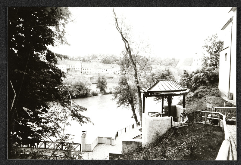 1987 Landesausstellung "Arbeit Mensch Maschine: Der Weg in die Industriegesellschaft". Blick von der Stiege, die vom Schloss Lamberg hinunter zum Museumssteg führt, Richtung Steyrdorf.