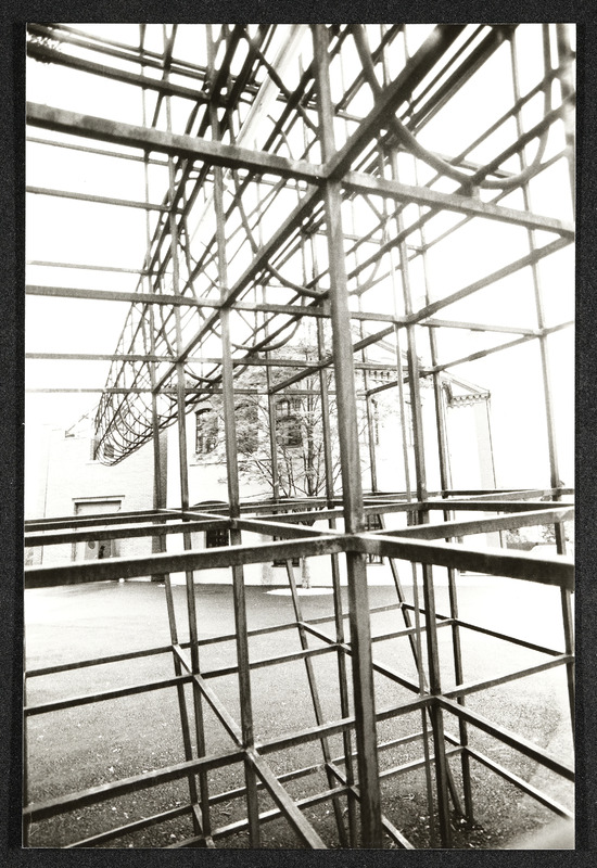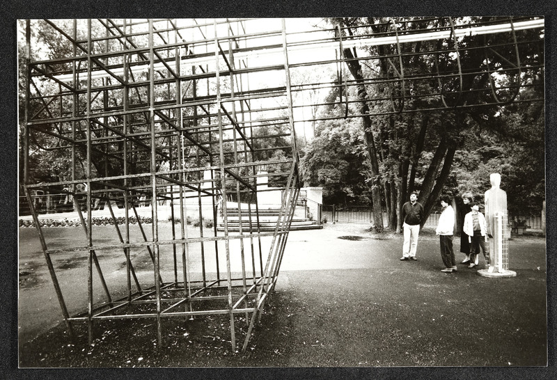 1987 Landesausstellung "Arbeit Mensch Maschine: Der Weg in die Industriegesellschaft". Detailaufnahme der Eisenhammer-Skulptur am Vorplatz des Museum Industrielle Arbeitswelt Steyr.