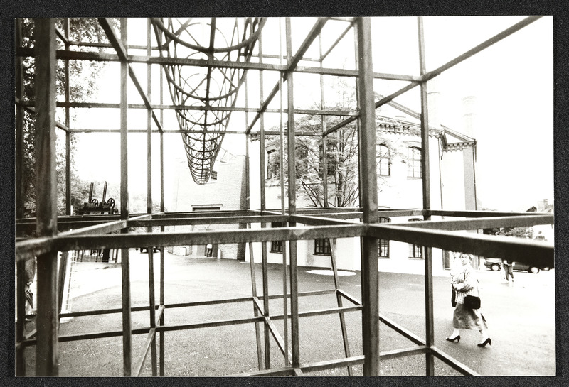 1987 Landesausstellung "Arbeit Mensch Maschine: Der Weg in die Industriegesellschaft". Eisenhammer-Skulptur am Vorplatz des Museum Industrielle Arbeitswelt Steyr.