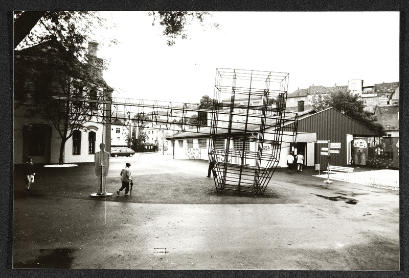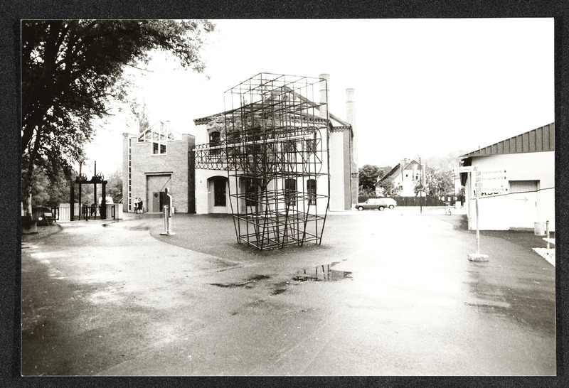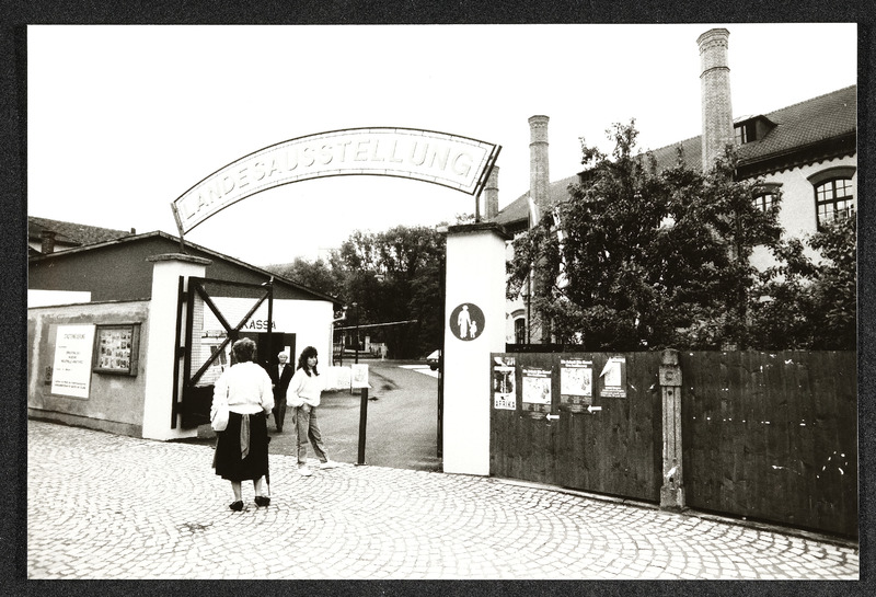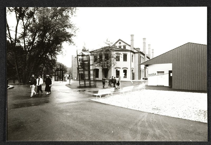 1987 Landesausstellung "Arbeit Mensch Maschine: Der Weg in die Industriegesellschaft". Blick auf das Kassa-Gebäude der Landesausstellung und den Vorplatz des Museum Industrielle Arbeitswelt Steyr.