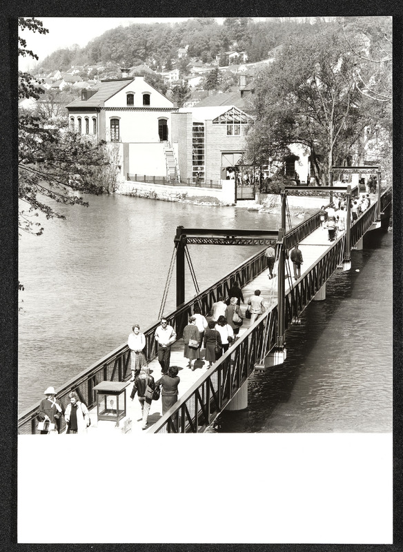 1987 Landesausstellung "Arbeit Mensch Maschine: Der Weg in die Industriegesellschaft". Blick über den neuen Museumssteg zum Museum Industrielle Arbeitswelt Steyr.
