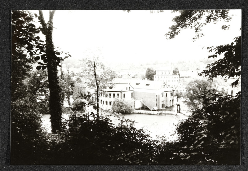 1987 Landesausstellung "Arbeit Mensch Maschine: Der Weg in die Industriegesellschaft". Blick vom Schloss Lamberg hinunter zur Ost- und Südseite des Museum Industrielle Arbeitswelt Steyr.