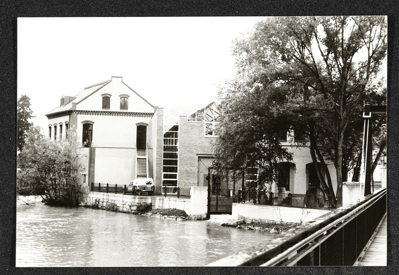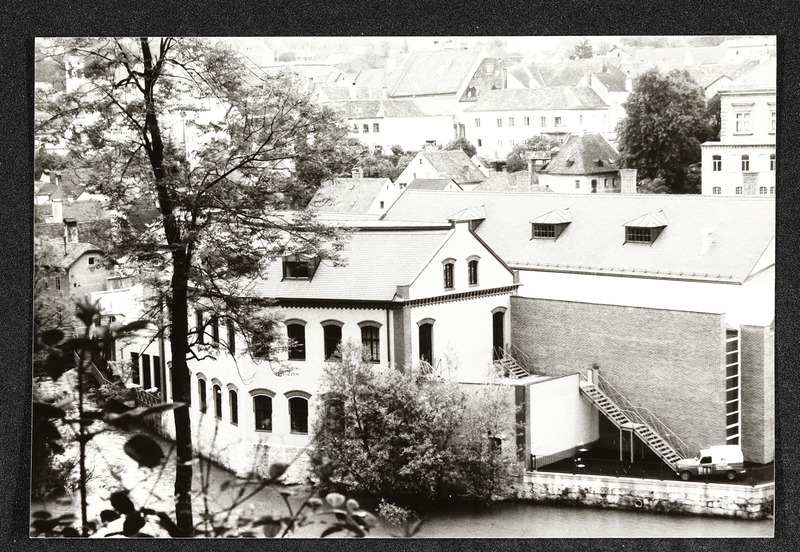 1987 Landesausstellung "Arbeit Mensch Maschine: Der Weg in die Industriegesellschaft". Blick vom Museumssteg zur Ostseite mit Haupteingang des Museum Industrielle Arbeitswelt Steyr.