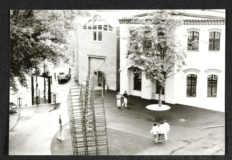 1987 Landesausstellung "Arbeit Mensch Maschine: Der Weg in die Industriegesellschaft". Blick vom Steg zum Vorplatz des Museum Industrielle Arbeitswelt Steyr.