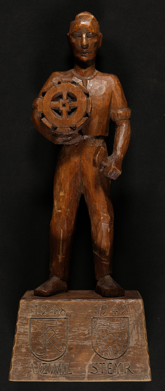 Holzfigur, aus Freundschaft gewidmet vom Arbeiter-Männerchor, Uzwil 1948, Steyr 1949