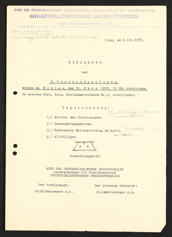 Einladung zur 2. Vorstandssitzung, Linz, 9. März 1937, Bund der österreichischen Industriellen Landesverband für Oberösterriech, Industriellenverband Oberösterreich, handschriftliche Notiz