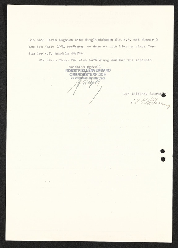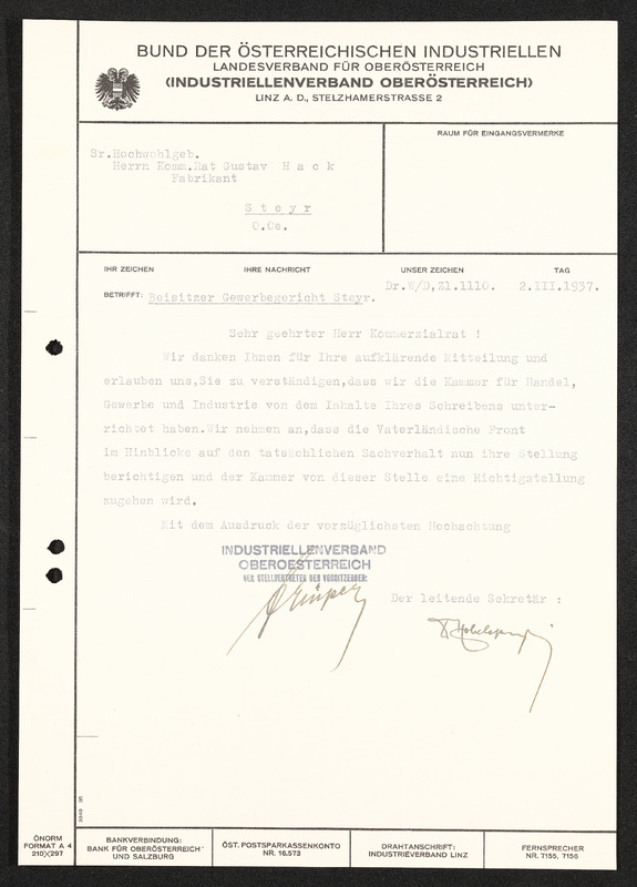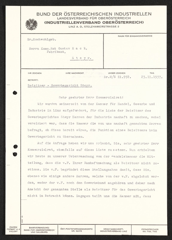 Schreiben vom Bund der österreichischen Industriellen, Landesverband für Oberösterriech an Gustav Hack, betreffend Beisitzer Gewerbegericht Steyr, 23. Februar 1937