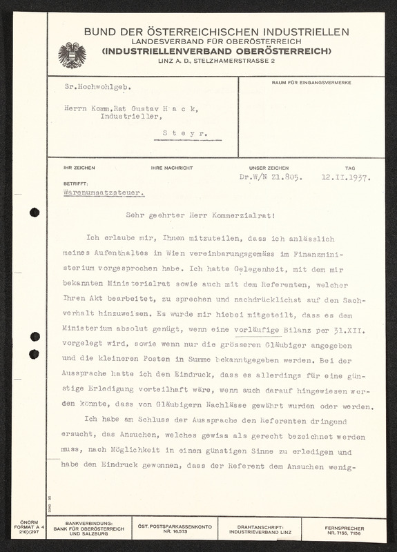 Schreiben vom Bund der österreichischen Industriellen, Landesverband für Oberösterriech an Gustav Hack, betreffend Warenumstatzsteuer, 12. Februar 1937