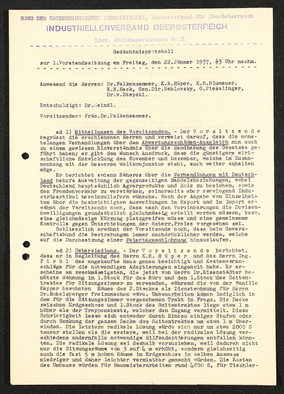 Gedächnisprotokoll zur 1. Vorstandssitzung am 22. Jänner 1937, Bund der österreichischen Industriellen Landesverband für Oberösterriech, Industriellenverband Oberösterreich