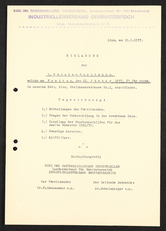Einladung zur 2. Vorstandssitzung, Linz, 9. März 1937, Bund der österreichischen Industriellen Landesverband für Oberösterriech, Industriellenverband Oberösterreich