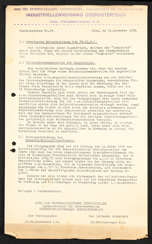 Rundschreiben Nr. 19., Linz, 15. Dezember 1936, Bund der österreichischen Industriellen Landesverband für Oberösterriech, Industriellenverband Oberösterreich