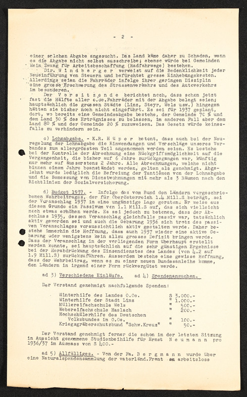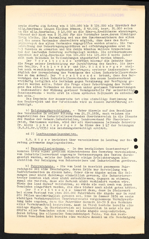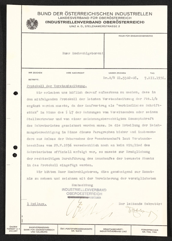 Protokoll der Vorstandssitzung, 7. Dezember 1936, Bund der österreichischen Industriellen, Landesverband für Oberösterriech, Industriellenverband Oberösterreich