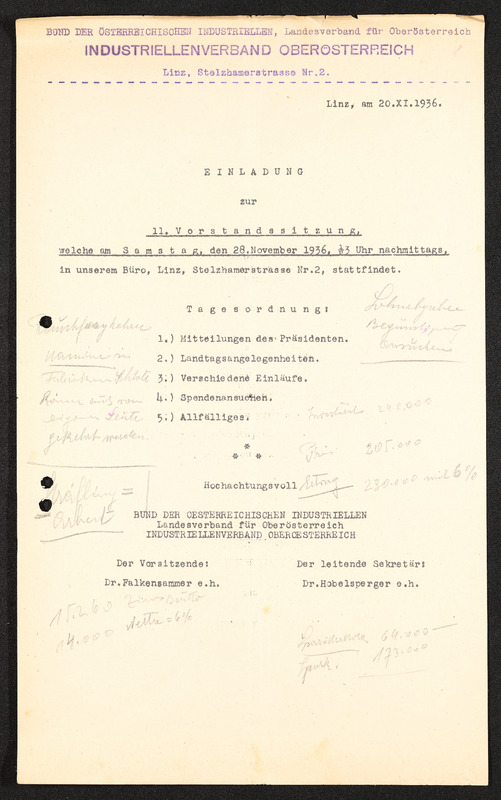 Einladung zur 11. Vorstandssitzung, Linz, 20. November 1936, Bund der österreichischen Industriellen, Landesverband für Oberösterriech, Industriellenverband Oberösterreich