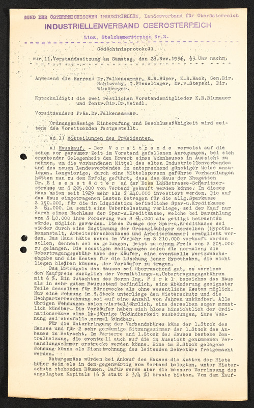 Gedächnisprotokoll zur 11. Vorstandssitzung am 28. November 1936, Bund der österreichischen Industriellen Landesverband für Oberösterriech, Industriellenverband Oberösterreich