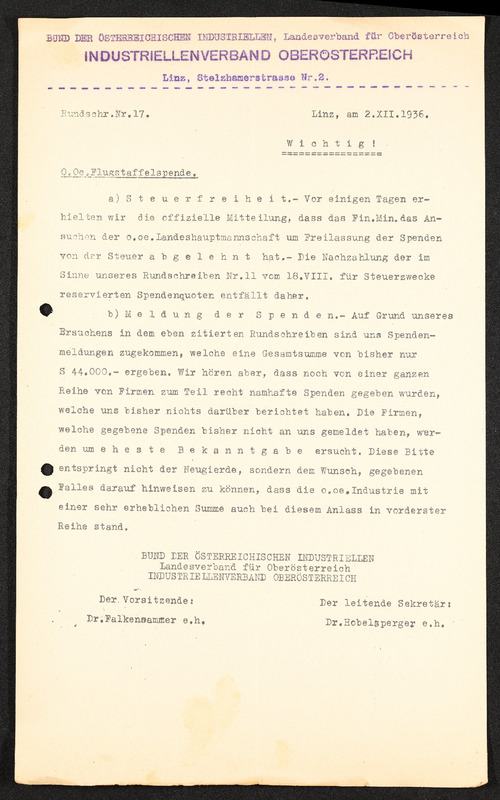 Runschreiben Nr. 17, Linz, 2. Dezember 1936, Bund der österreichischen Industriellen Landesverband für Oberösterriech, Industriellenverband Oberösterreich