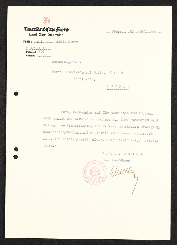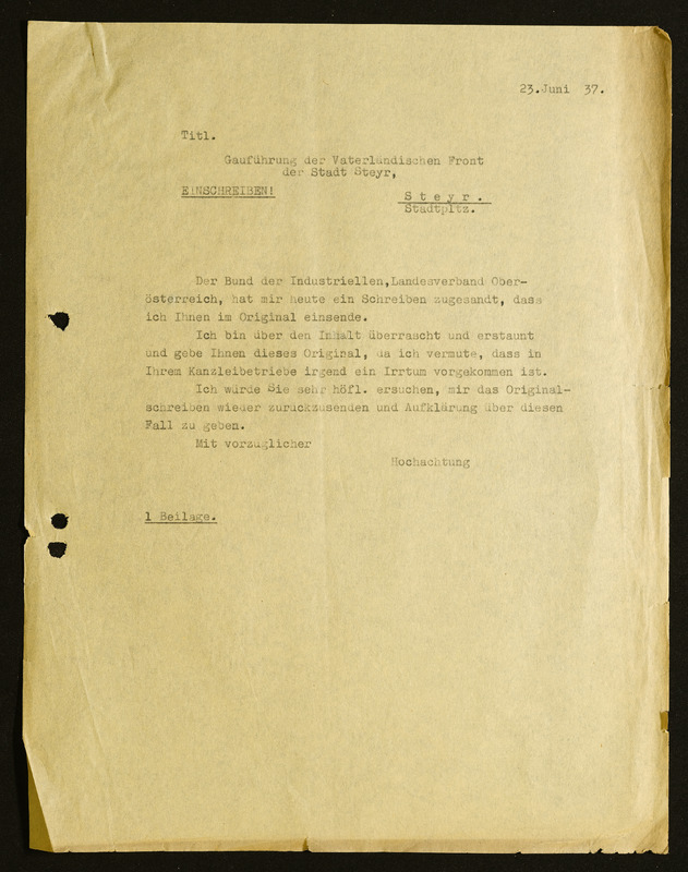 Einladung zur 3. Vorstandssitzung, Linz, 1. Juni 1937, Bund der österreichischen Industriellen Landesverband für Oberösterriech, Industriellenverband Oberösterreich, handschrifttliche Notiz
