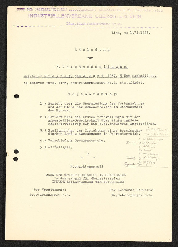 Einladung zur 3. Vorstandssitzung, Linz, 1. Juni 1937, Bund der österreichischen Industriellen Landesverband für Oberösterriech, Industriellenverband Oberösterreich,Handschrifttliche Notizen, unleserlich