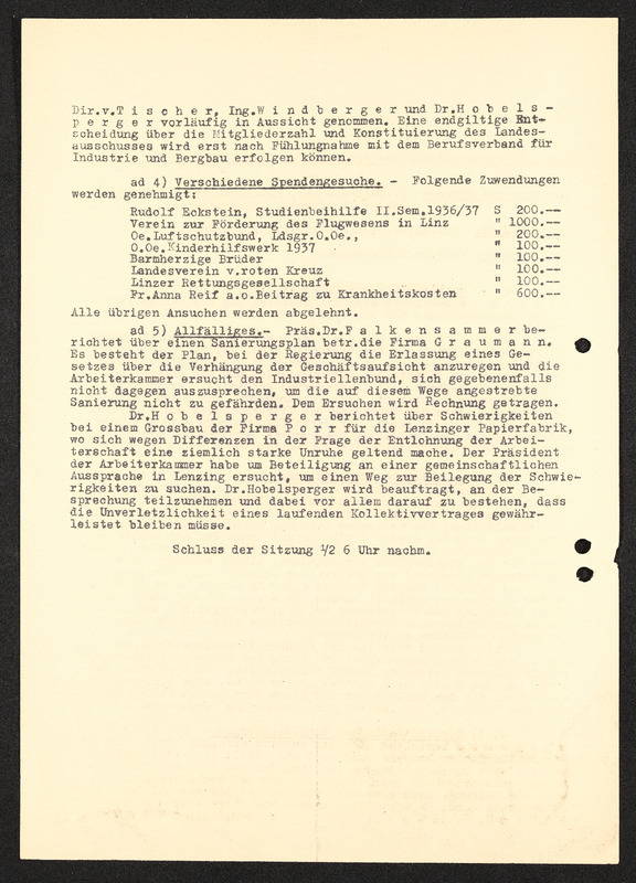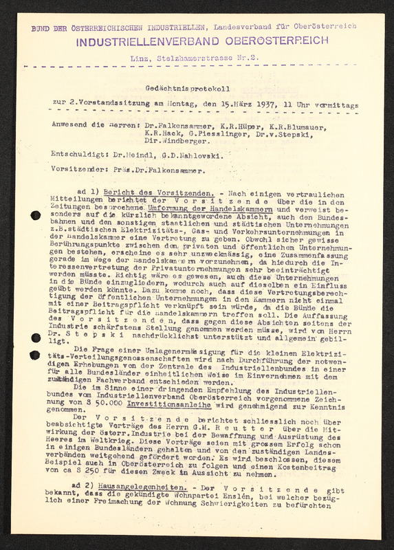 Gedächnisprotokoll zur 2. Vorstandssitzung am 15. März 1937, Bund der österreichischen Industriellen Landesverband für Oberösterriech, Industriellenverband Oberösterreich