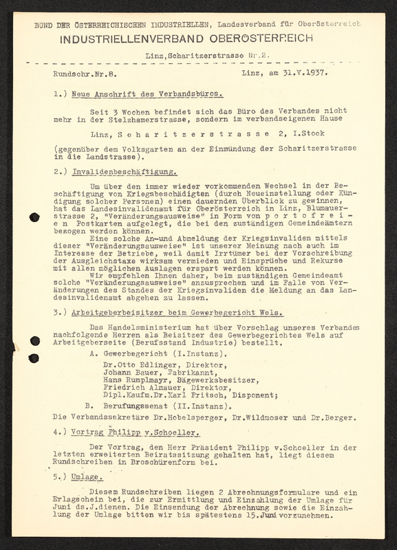 Rundschreiben Nr. 8, Linz, 31. Mai 1937, Bund der österreichischen Industriellen Landesverband für Oberösterriech, Industriellenverband Oberösterreich, betreffend Invalidenbeschäftigung, Arbeitgeberbeisitzer beim Gewerbegericht