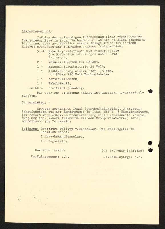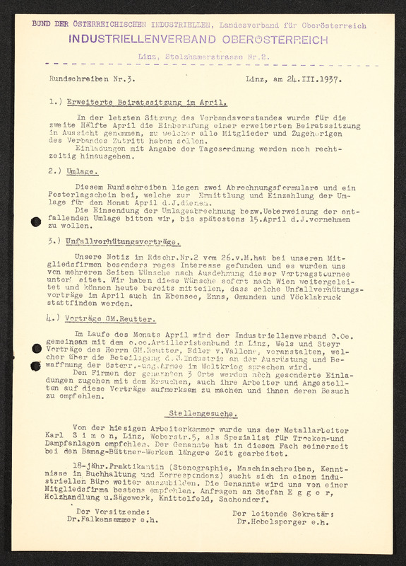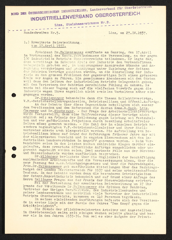 Rundschreiben Nr. 5, Linz, 27. April 1937, Bund der österreichischen Industriellen Landesverband für Oberösterriech, Industriellenverband Oberösterreich, Erweiterte Beiratssitzung