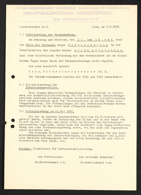 Rundschreiben Nr. 5, Linz, 27. April 1937, Bund der österreichischen Industriellen Landesverband für Oberösterriech, Industriellenverband Oberösterreich, Luftschutz, Rahmenvertrag Textilindustrie
