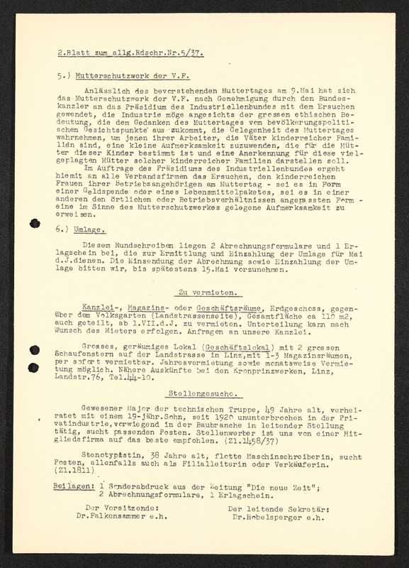 Rundschreiben Nr. 5, Linz, 27. April 1937, Bund der österreichischen Industriellen Landesverband für Oberösterriech, Industriellenverband Oberösterreich, Mutterschutz, Stellengesuche
