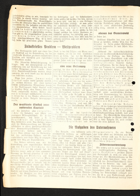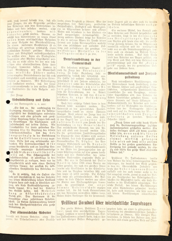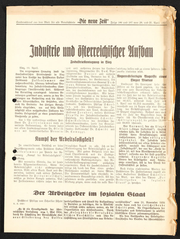 Die Neue Zeit, Folge 106 und 107 vom 20. und 21. April 1937, Artikel über die Industriellen-Tagung in Linz mit dem Titel "Industrie und österreichischer Aufbau"