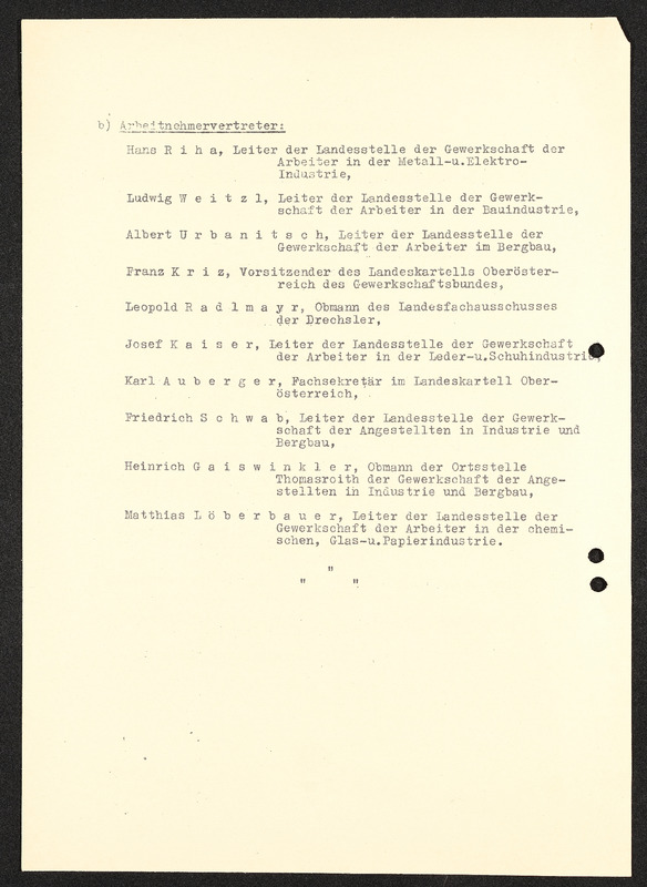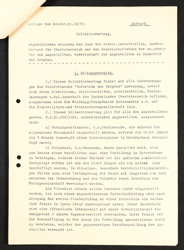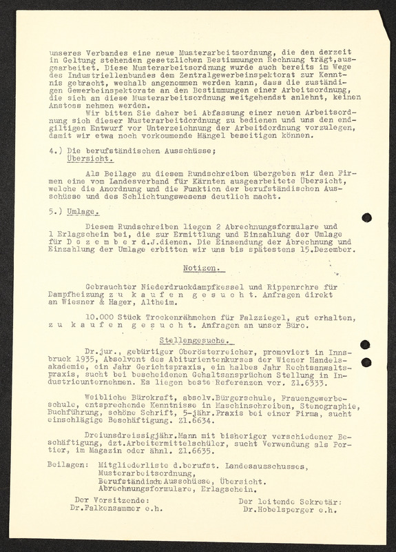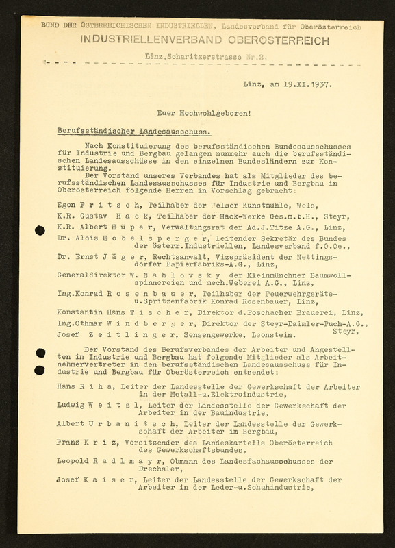 Rundschreiben Industriellenverband Oberösterreich Nr. 19, Konstitutierung des berufsständischen Landesausschusses für Industrie und Bergbau in Oberösterreich am 1. Dezember 1937