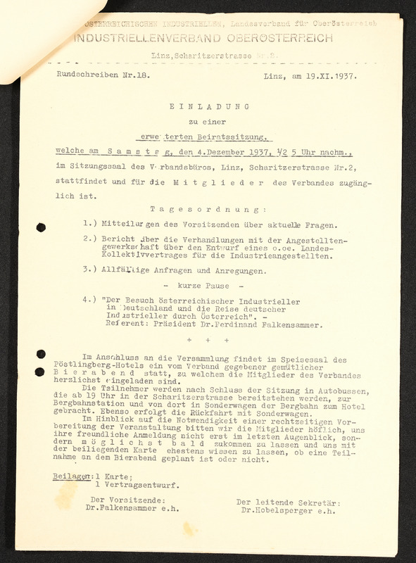 Rundschreiben Nr. 18, Bund der Österreichischen Industriellen, Landesverband für Oberösterreich, Einladung zu einer erweiterten Beiratssitzung, Linz am 19. November 1937
