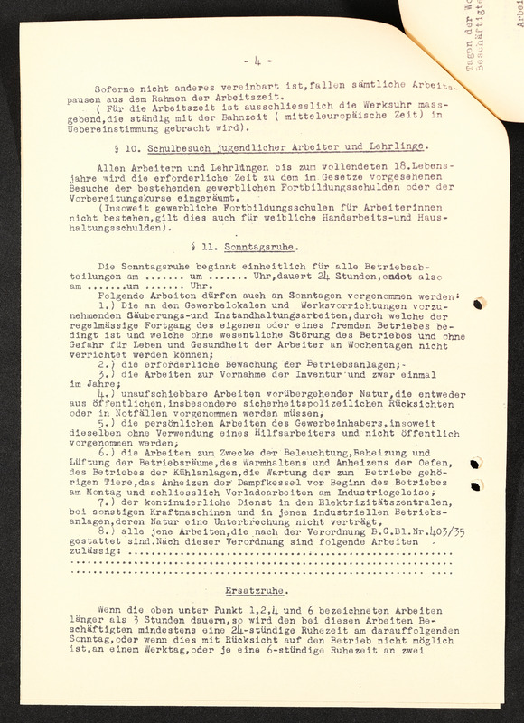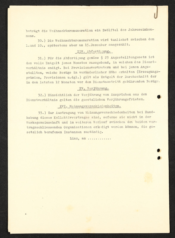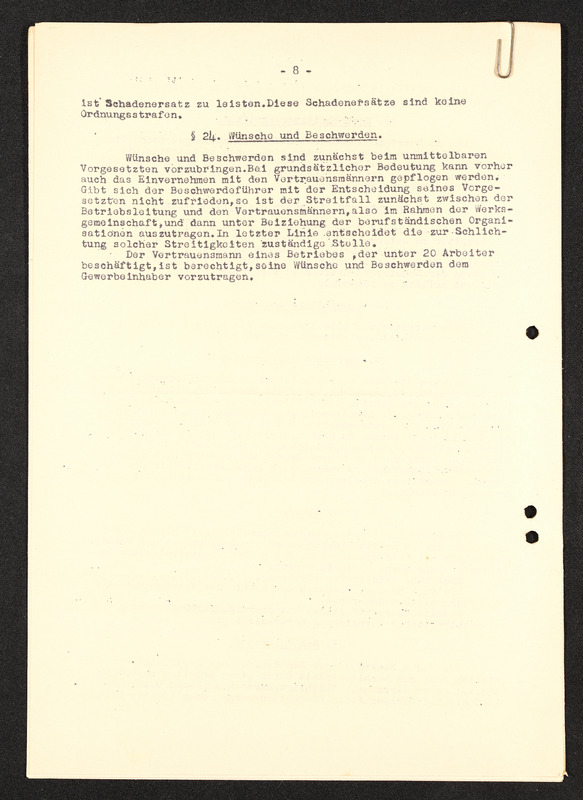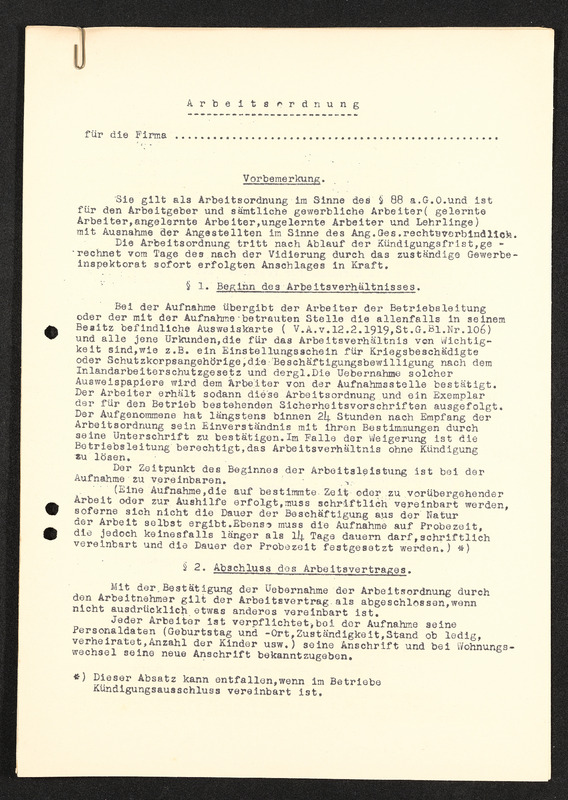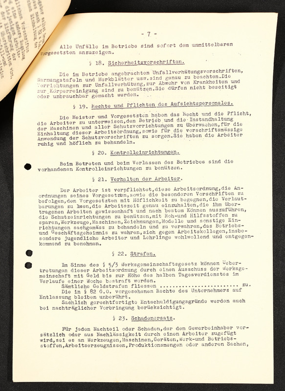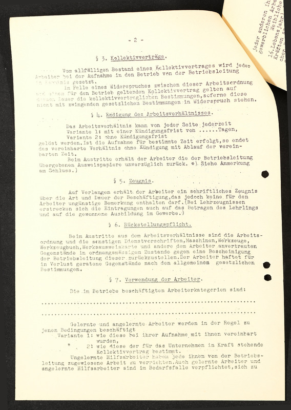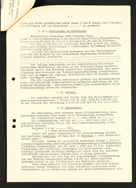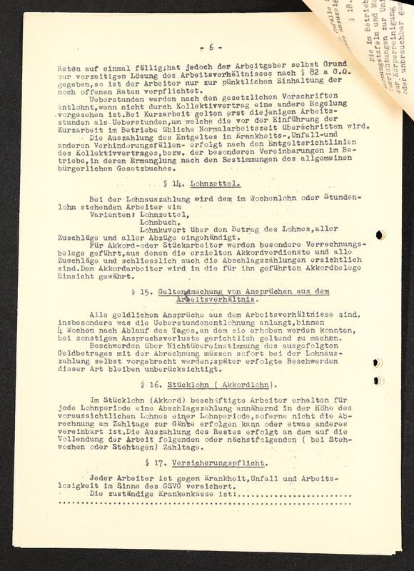 Arbeitsordnung, Seite 6, §13 fortfühend, §14. Lohnzettel, §15. Geltendmachung von Ansprüchen aus dem Arbeitsverhältnis, §16. Stücklohn (Akkordlohn), §17. Versicherungspflicht