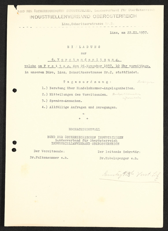 Einladung zur 6. Vorstandssitzung, Bund der Österreichischen Industriellen, Landesverband Oberösterreich Industriellenverband Oberösterreich, Linz am 22. November 1937