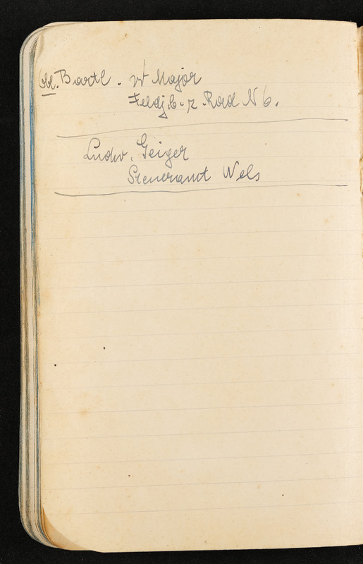 Notizbuch von Ludwig Pullirsch: Einträge: Oberleutnant Bartl und Major, Feldjägerbataillon Rad Nr. 6, Ludwig Geiger, Steueramt Wels, Seite 200