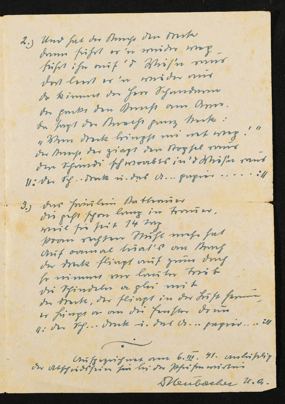 Eingelegtes Doppelblatt im Notizbuch von Ludwig Pullirsch, zweite Seite des Textes "Die Gondoliera" - aufgezeichnet am 6. März 1941
