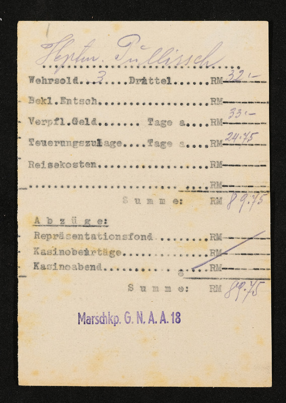 Eingelegtes Blatt im Notizbuch von Ludwig Pullirsch: Wehrsoldabrechung Hauptmann Ludwig Pullirsch