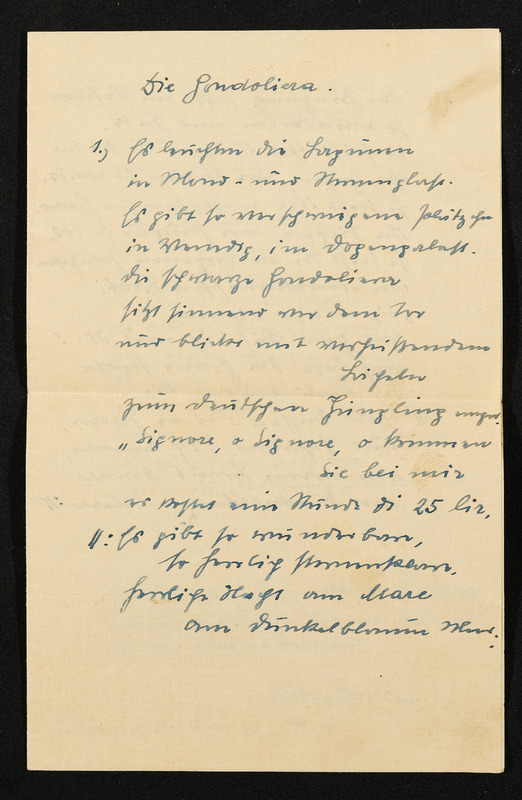 Eingelegtes Doppelblatt im Notizbuch von Ludwig Pullirsch, erste Seite des Textes "Die Gondoliera" - aufgezeichnet am 6. März 1941