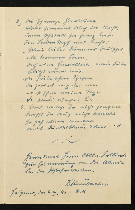 Eingelegtes Doppelblatt im Notizbuch von Ludwig Pullirsch, dritte Seite des Textes "Die Gondoliera" - aufgezeichnet am 6. März 1941