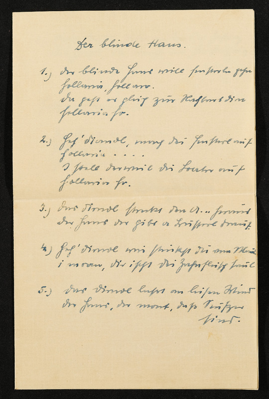 Eingelegtes Doppelblatt im Notizbuch von Ludwig Pullirsch, erste Seite des Textes "Der blinde Hans" - aufgezeichnet am 6. März 1941