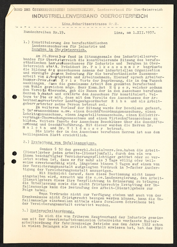 Rundschreiben Industriellenverband Oberösterreich Nr. 19, Konstitutierung des berufsständischen Landesausschusses für Industrie und Bergbau in Oberösterreich am 1. Dezember 1937