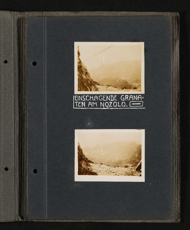 Fotoalbum FRONT 1918 von Ludwig Pullirsch, Blatt 13. Zwei Fotos: Einschlagende Granaten am Nozzolo