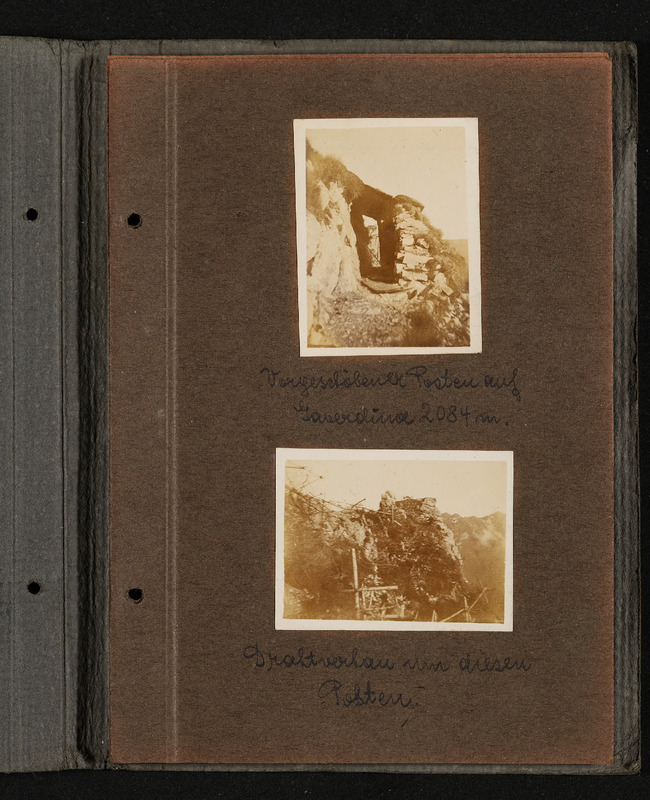 Fotoalbum FRONT 1918 von Ludwig Pullirsch, Blatt 14. Foto oben: vorgeschobener Posten auf Gaverdina 2084m, Foto unten: Drahtverbau um diesen Posten