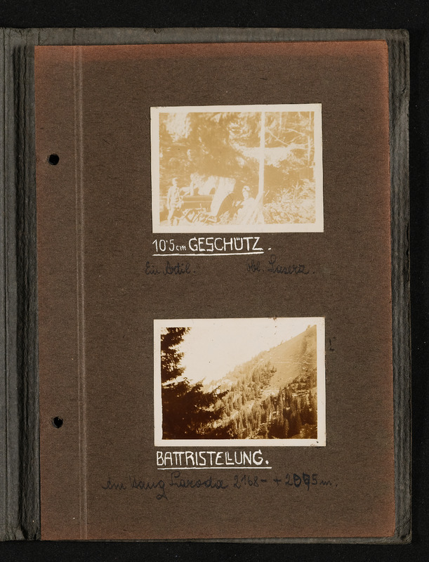Fotoalbum FRONT 1918 von Ludwig Pullirsch, Blatt 15. Foto oben: 10,5cm Geschütz, Foto unten: Battristellung