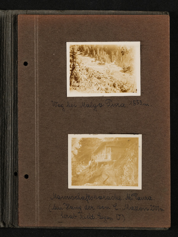 Fotoalbum FRONT 1918 von Ludwig Pullirsch, Blatt 3. Foto oben: Weg bei Malga Pura 1553m, Foto unten: Mannschaftsbaracke