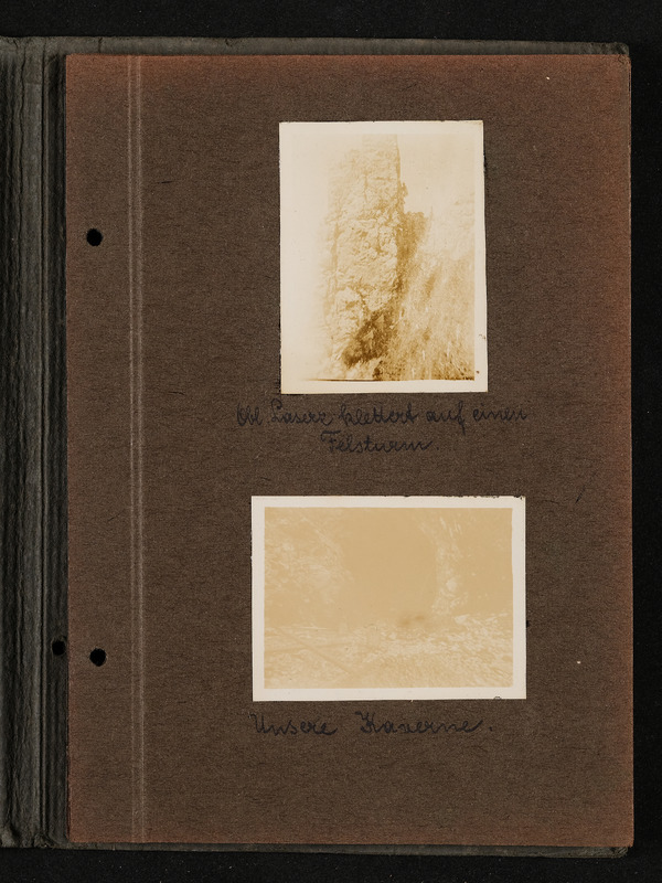 Fotoalbum FRONT 1918 von Ludwig Pullirsch, Blatt 4. Foto oben: Laserz klettert auf einen Felsturm, Foto unten: Unsere Kaverne
