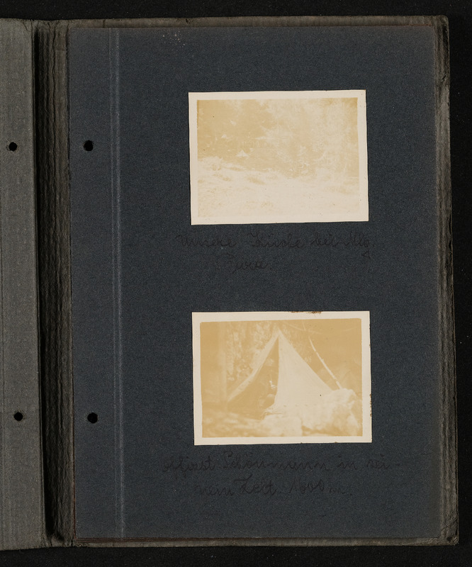 Fotoalbum FRONT 1918 von Ludwig Pullirsch, Blatt 7. Bild oben: unsere Küche bei Malga Pura. Bild unten: Schönmann in seinem Zelt 1600m