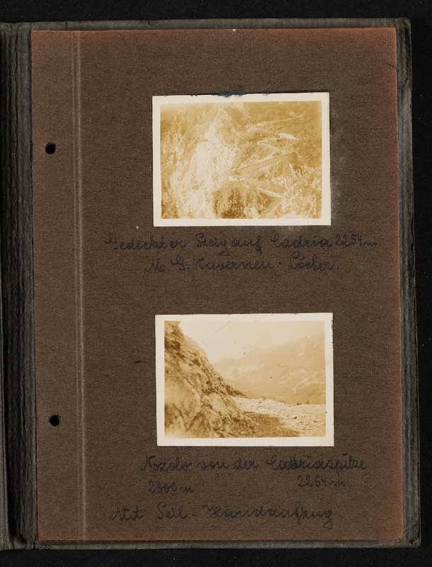 Fotoalbum FRONT 1918 von Ludwig Pullirsch, Blatt 8. Foto oben: Gedeckter Steig auf den Monte Cadria 2254m, Maschinengewehr Kavernen-Löcher, Foto unten: Monte Nozzolo 2000m von der Cadriaspitze 2254m, mit Seil-Handaufzug
