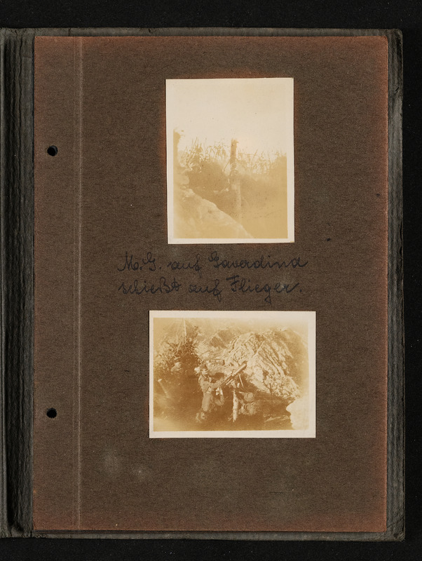 Fotoalbum FRONT 1918 von Ludwig Pullirsch, Blatt 10. Zwei Fotos: Maschinengewehr auf Gaverdina schießt auf Flieger